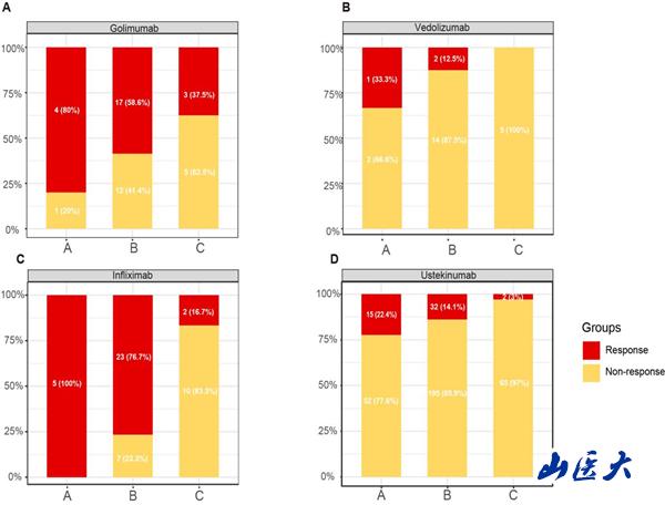 本研究對455例潰瘍性結腸炎(UC)患者腸黏膜轉錄組微陣列的測序結果進行分析,在UC患者中發現三種具有特異性基因表達模式的新亞型,其中兩種UC亞型分別以免疫細胞激活和上皮細胞增殖為標志,第三種亞型共享免疫細胞和上皮細胞增殖信號通路的特征(命名為“混合型”)。該結果在100例UC腸黏膜轉錄組高通量的測序結果中得到進一步驗證,而在獨立UC患者隊列中證實了上皮細胞增殖型UC患者對常用生物制劑療法的顯著臨床效果。