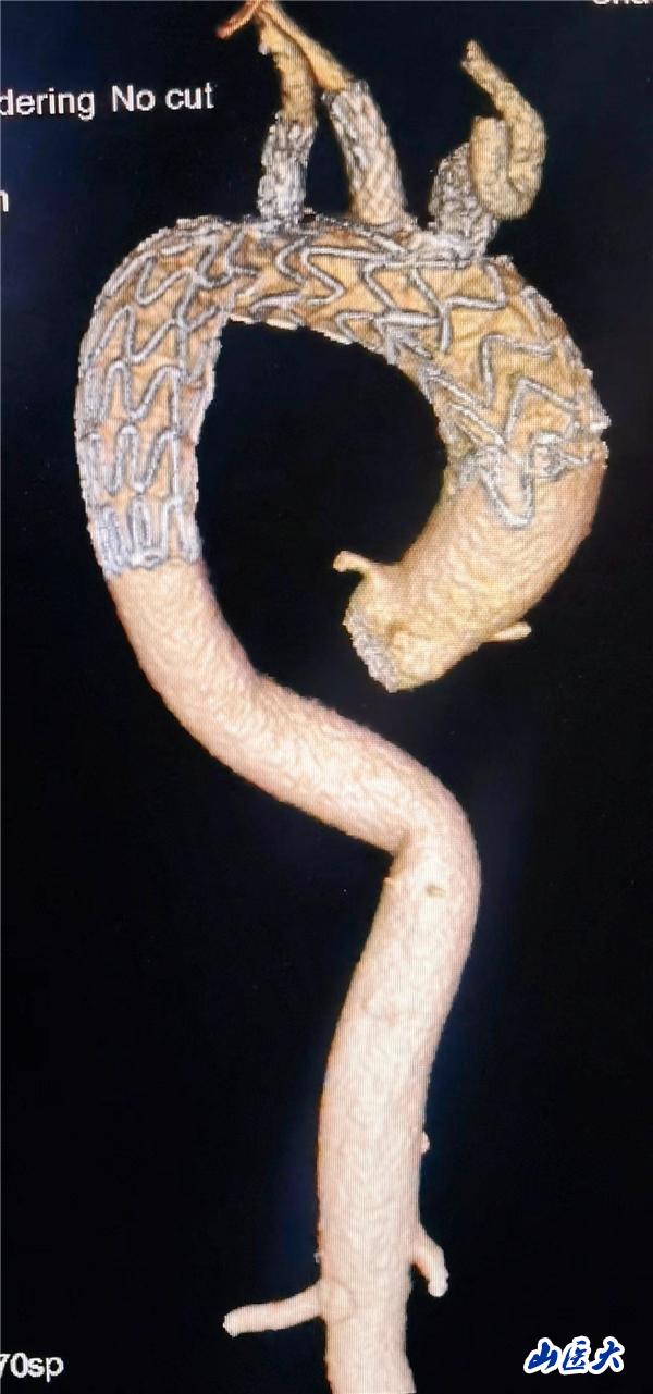 首例患者是一位55歲的女性,她患有高血壓約2年時間,平時也會規律服用多種降壓藥,但血壓控制始終不盡人意。2023年4月下午,她出現不明原因的頭痛,在家拔罐緩解少許便未到醫院就醫,次日凌晨突感胸悶、胸背疼痛伴有呼吸困難等癥狀、家人急忙撥打了120,把患者送入醫院急診科進行救治,醫生在急診科行胸腹主動脈CTA時,顯示主動脈弓部-降主動脈及腹主動脈壁間血腫,遂收治入醫院血管外科,患者入院10天后復查血腫仍未有改善,依然伴有胸背部疼痛等不適,如不進一步處理,可能發展為夾層危及生命,患者及家屬經過與醫生團隊了解溝通,決定進行創傷小、恢復快的介入手術治療。張瑋教授、符偉國教授、董紅霖教授及其血管外科團隊(閆盛、常文凱、田琴琴)共同商討手術方案,最終確定使用Zipper?一體式主動脈弓覆膜支架系統,行胸主動脈覆膜支架腔內隔絕術+無名動脈、左頸總動脈、左鎖骨下動脈分支重建術為患者進行治療。董紅霖教授及其血管外科團隊根據患者術前頭顱CT平掃提示雙側側腦室旁缺血灶,血壓控制不穩定,屬夾層壁間血腫非典型夾層等風險點,制定了完整的手術方案,術中經股動脈置入Zipper支架主體,經預留導絲超選無名動脈,并確保主體支架對位準確,順利置入左頸總動脈、左鎖骨下動脈支架,重建弓上三分支。手術過程非常順利。術后觀察主動脈及分支覆膜支架定位準確;無內漏;分支支架通暢,動脈供血正常。