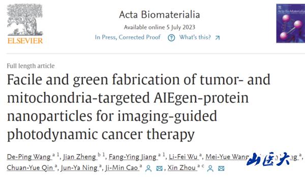 近期,細胞生理學教育部重點實驗室曹濟民教授和周鑫教授團隊在高水平國際學術期刊《Acta Biomaterialia》(中科院一區top期刊,影響因子10.633)發表了最新研究成果:《Facile and green fabrication of tumor- and mitochondria-targeted AIEgen-protein nanoparticles for imaging-guided photodynamic cancer therapy》。青年教師王德平、博士生鄭健及碩士生蔣芳穎為本文共同第一作者,曹濟民教授和周鑫教授為共同通訊作者。