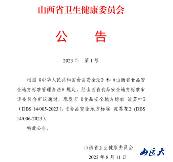 2020年,山西省衛生健康委員會立項《食品安全地方標準 流蘇葉》《食品安全地方標準 流蘇花》,我校營養與食品衛生學學科帶頭人、山西省營養學會理事長邱服斌教授擔任項目負責人。經現場考察、資料收集與調研、樣品采集檢驗、標準起草、意見征求和山西省衛生健康委員會審查評議,歷時兩年多,成功發布這兩項標準。