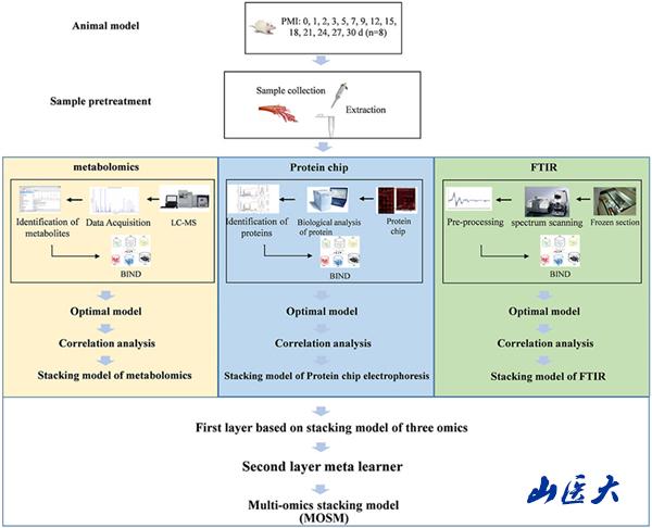 近期,c7c7.app法醫(yī)學(xué)院孫俊紅教授團(tuán)隊(duì)在高水平國(guó)際學(xué)術(shù)期刊Talanta(分析化學(xué))(中科院1區(qū)top期刊,影響因子6.1分)發(fā)表了最新研究成果:《Multi-omicsintegrationstrategyinthepost-mortemintervalofforensicscience》。博士研究生李健為本文第一作者。這項(xiàng)研究應(yīng)用人工智能的多組學(xué)分析策略,整合了代謝組學(xué)、蛋白質(zhì)芯片和傅里葉紅外變換分析鑒定的多水平、多模態(tài)、多標(biāo)記數(shù)據(jù)用于預(yù)測(cè)死亡時(shí)間,表現(xiàn)出卓越的性能。更重要的是,該研究也為其他學(xué)科及不同實(shí)驗(yàn)平臺(tái)、不同來(lái)源的多模態(tài)數(shù)據(jù)整合分析提供了新的思路。(https://doi.org/10.1016/j.talanta.2023.125249)