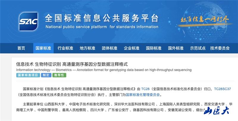 近日,全國標準信息公共服務平臺發布公告,由我校嚴江偉教授牽頭,我校和中國電子技術標準化研究院、深圳華大法醫科技有限公司等20余家國內單位共同申報的國家標準《信息技術 生物特征識別 高通量測序基因分型數據注釋格式》獲批立項公示,這是我校首次作為牽頭單位起草的國家標準。