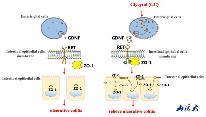 潰瘍性結腸炎(UC)因其病程長、癌變檢出率高、并發癥多,且呈現出年輕化、反復發作、遷延不愈等特點,被稱為“綠色癌癥”。最新數據顯示,中國有229.6萬人患有UC,且發病率逐年持續增加。然而,目前UC仍缺乏徹底治愈的醫療手段,緩解UC患者的腸道“痛點”,改善其健康狀況,是備受患者、家屬、醫生乃至科研人員關注的難點問題。UC的發病與多種因素緊密相關,本研究聚焦腸粘膜機械屏障,從“腸膠質細胞調控腸上皮細胞”的新視角,提出“甘草酚通過促進腸膠質細胞GDNF產生,激活GDNF/RET途徑,促進ZO-1與細胞膜融合,保護腸粘膜機械屏障,緩解UC”的科學假說,為UC的防治提供新思路,拓展了保護腸粘膜機械屏障的現有途徑。