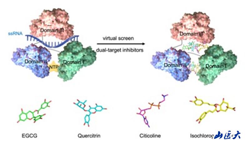 2. 巴加扎病毒(BAGV)解旋酶(helicase)的晶體結構解析及抑制劑篩選。BAGV是一種黃病毒,以蚊蟲為傳播媒介,不僅引起了嚴重的禽類死亡,人體感染后還會引起腦炎。BAGV基因組編碼10種蛋白,包括3種結構蛋白和7種非結構蛋白。BAGV的NS3蛋白的C端在BAGV復制過程中起解旋酶的作用,利用ATP水解能量將病毒RNA雙鏈解開以幫助病毒進一步復制。該工作解析了BAGV helicase的晶體結構,揭示了該helicase中的NTP和RNA結合口袋,可作為抗BAGV藥物的靶點。基于該解旋酶的晶體結構,通過虛擬篩。⑾至20種同時靶向NTP結合位點和RNA結合位點的化合物。并通過分子對接、氨基酸突變分析、等溫滴定量熱法(ITC)和ATP酶活檢測,發(fā)現(xiàn)EGCG、Quercitrin、Citicoline sodium及Isochlorogenic acid C對BAGV解旋酶的雙靶點的親和力高,并能明顯抑制ATP酶的活性,因而這四種化合物可能是最有前景的BAGV抑制劑。該工作的亮點是發(fā)現(xiàn)了BAGV helicase的雙靶點抑制劑,這為推進針對BAGV以及其他黃病毒的創(chuàng)新藥物發(fā)現(xiàn)提供了新的策略。