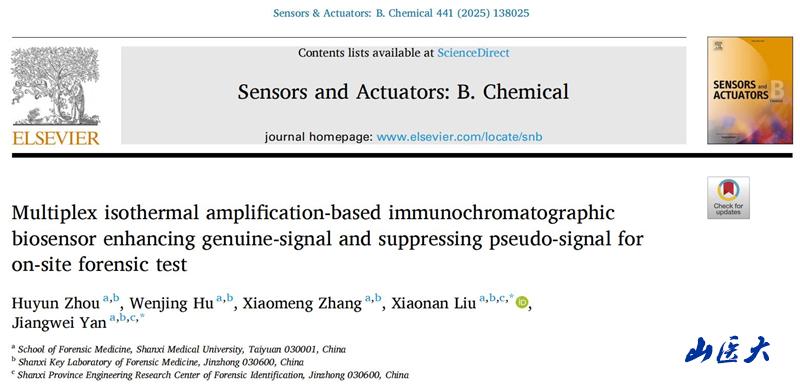 近日,我校法醫學院嚴江偉教授團隊在國際分析化學領域頂級期刊《Sensors and Actuators B: Chemical》上發表了題為“Multiplex isothermal amplification-based immunochromatographic biosensor enhancing genuine-signal and suppressing pseudo-signal for on-site forensic test”的研究成果。