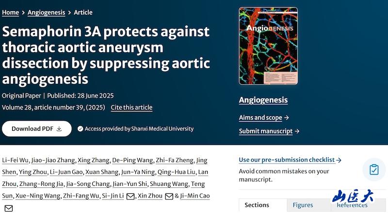 6月28日,我校細胞生理學教育部重點實驗室曹濟民教授團隊在血管再生領域的國際權威期刊《Angiogenesis》(中國科學院一區TOP期刊,IF=9.2)在線發表了題為“Semaphorin 3A protects against thoracic aortic aneurysm dissection by suppressing aortic angiogenesis”的研究論文(DOI: 10.1007/s10456-025-09992-6)。我校基礎醫學院講師武栗妃為論文第一作者,曹濟民教授為主通訊作者。