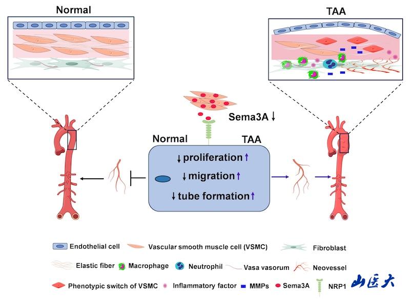 本研究首次證明了Sema3A是TAA的一個內源性保護因子;促進主動脈平滑肌細胞內源性Sema3A表達或給予外源性Sema3A重組蛋白對TAA有治療作用。作為一種可能的TAA非手術療法,Sema3A重組蛋白有潛在臨床價值。