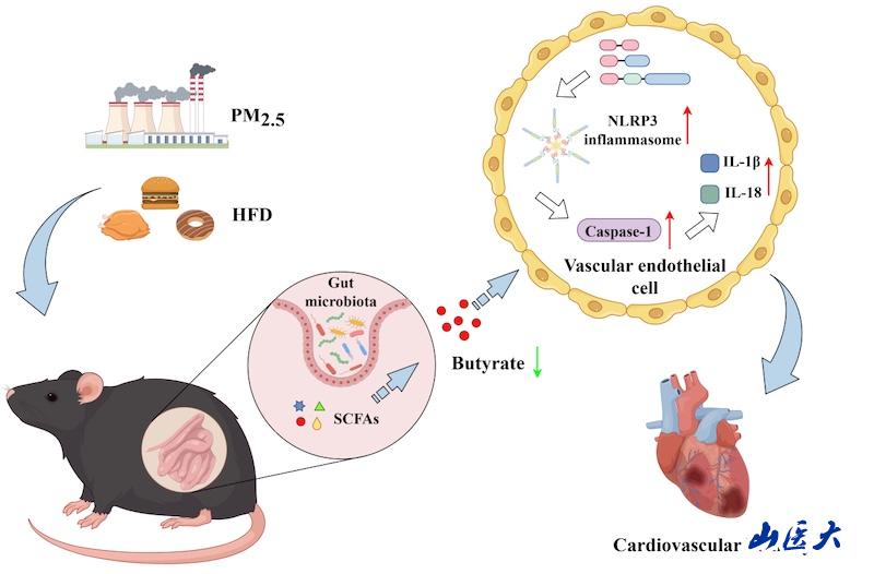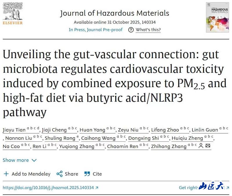 10月31日,我校公共衛生學院、煤炭環境與致病教育部重點實驗室張志紅教授團隊在環境科學與生態學領域權威期刊Journal of Hazardous Materials(中國科學院一區Top期刊,IF=11.3)發表最新研究成果《Unveiling the gut-vascular connection: gut microbiota regulates cardiovascular toxicity induced by combined exposure to PM2.5 and high-fat diet via butyric acid/NLRP3 pathway》。公共衛生學院環境衛生學教研室2025屆博士田家瑜為論文第一作者,張志紅教授為通訊作者。