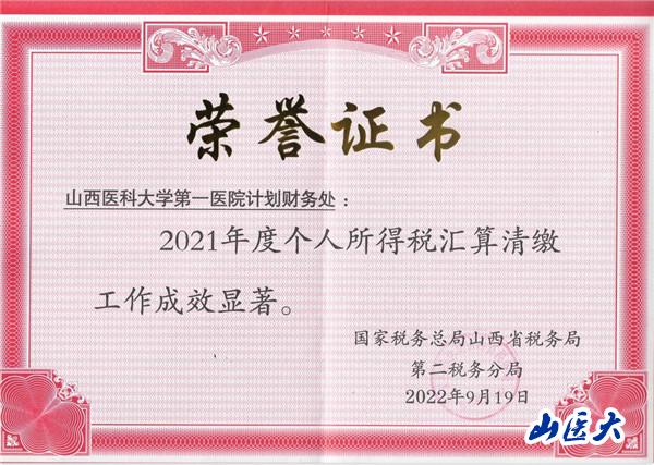 9月19日,國家稅務總局山西省稅務局第二稅務分局組織召開2021年度個人所得匯算清繳工作交流會,通報表彰匯算工作完成較好的單位。第一醫院計劃財務處獲通報表彰,并在省級醫院財務處室中位列第一名。