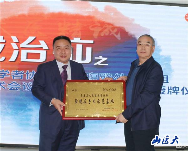 授牌儀式上,大會主席趙文波主任代表山西省專家學者協會授予靈丘縣人民醫院普外科“腔鏡疝手術示范基地”牌匾,靈丘縣人民醫院院長王會云代表縣人民醫院接受牌匾。