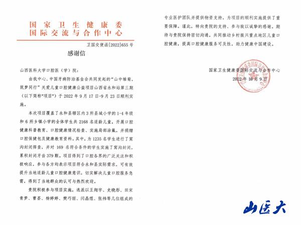 10月13日,我?誶灰皆菏盞揭環飫醋怨椅郎】滴式渙饔牒獻髦行牡母行恍。信中,國家衛生健康委國際交流與合作中心對口腔醫院在2022年“9·20全國愛牙日”期間,積極參與“山中雛菊 筑夢同行”關愛兒童口腔健康公益行動的熱忱和精神給予了高度肯定,并對醫院派出的技術專業團隊及提供的物資支持表示了誠摯感謝。