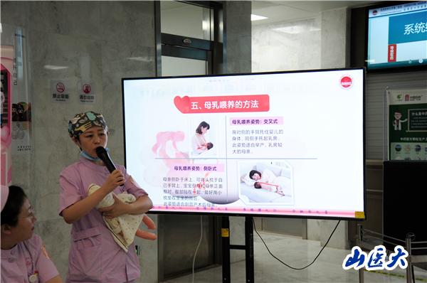 活動現。埔交と嗽,為大家講解了母乳喂養的相關知識,包括母乳喂養的好處、哺乳姿勢、喂養中常見的問題,并現場指導孕產婦喂養姿勢等。乳腺外科醫師講解了哺乳期乳房常見問題及處理方法,尤其是對哺乳期乳腺炎的臨床表現、治療及預防重點進行了宣講。新生兒科針對早產兒、母嬰分離的喂養做了詳細、認真的解答。預防保健科為孕產婦進行了母嬰保健指導。