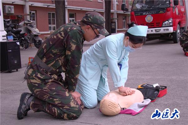 隨后,王云俊和任曉宇護士利用仿真人模型進行了操作演示,現場示范、同步講解、指出重點、強調難點,詳細講述了緊急情況下心肺復蘇的步驟和AED心臟除顫儀使用方法。為了提高實際操作能力,在醫護人員的指導下,多名老師和同學依次進行了心肺復蘇練習,特別是對胸外按壓、開放氣道、人工呼吸等技術進行重點實操。