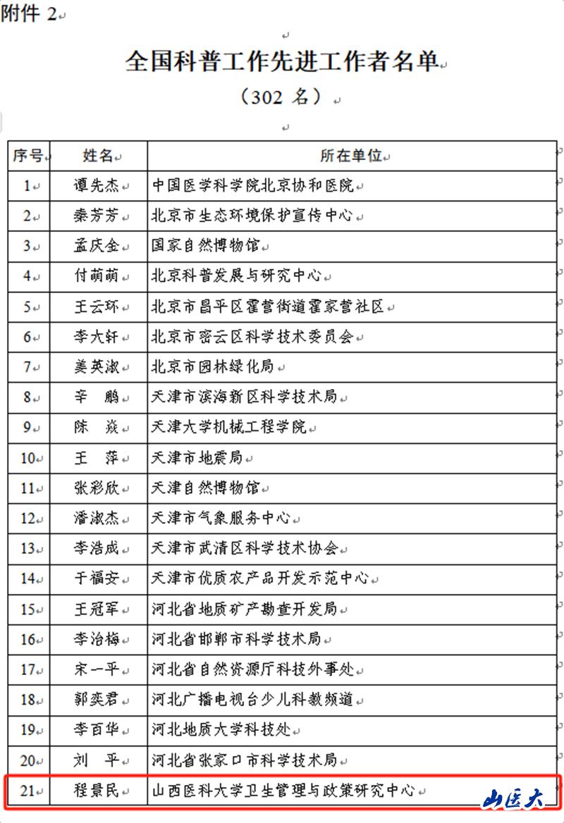 8月22日,科技部、中央宣傳部、中國科協發布了《關于表彰全國科普工作先進集體和先進工作者的決定》,決定對2020年以來在科普工作中作出突出貢獻的195個單位授予“全國科普工作先進集體”稱號,302名個人授予“全國科普工作先進工作者”稱號。我校程景民教授入選“全國科普工作先進工作者”。