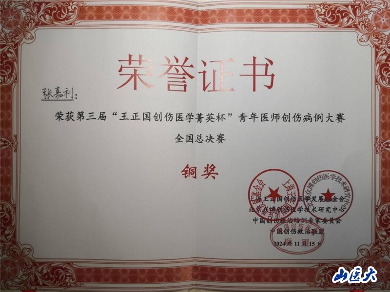 會議期間,舉辦了第三屆“王正國創傷醫學菁英杯”青年醫師創傷病例大賽全國總決賽。急診醫學中心張嘉利醫師作為“晉冀蒙”賽區一等獎獲得者參加了全國總決賽,并獲得銅獎。