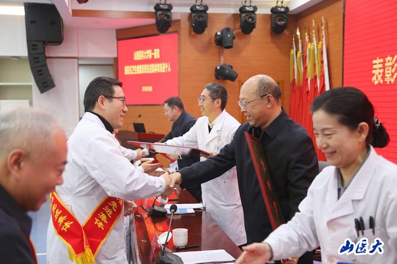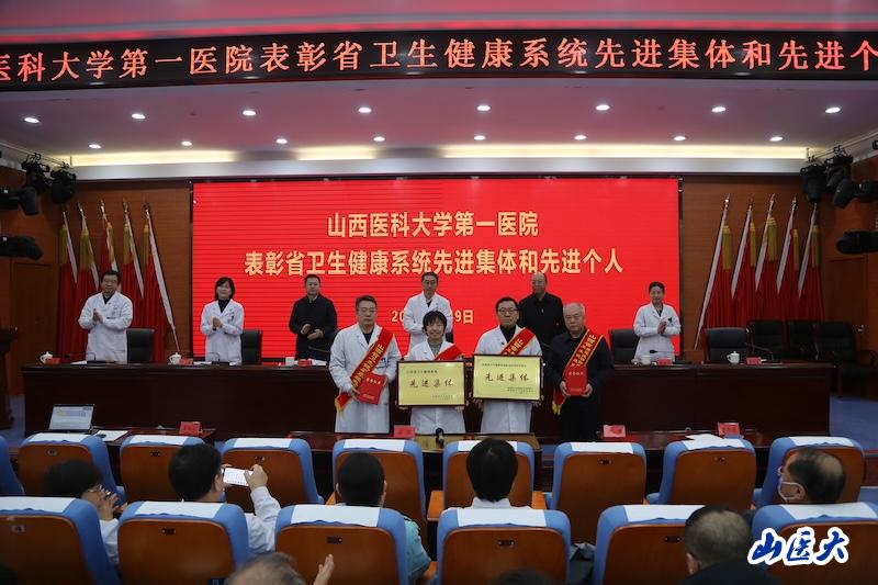 第一醫院黨委副書記吳旭東宣讀表彰決定。重癥醫學科、急診醫學中心榮獲“山西省衛生健康系統先進集體”“山西省衛生健康系統新冠疫情防控救治先進集體”稱號;張春明、姜增譽榮獲“山西省衛生健康系統先進個人”及“山西省衛生健康系統新冠疫情防控救治先進個人”稱號。院領導為獲得榮譽的先進集體和先進個人頒發牌匾及證書。