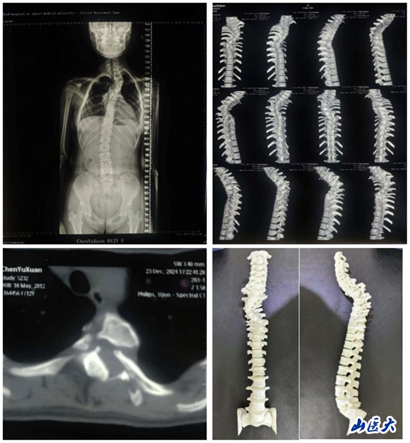 這位小姑娘自幼便全身布滿咖啡斑,但因家庭貧困且對疾病認知不足,一直未進行詳細檢查。2024年7月,其祖母偶然發現孩子脊柱出現明顯畸形,遂展開多方求醫之路。在得知我校第二醫院骨科脊柱畸形專業組薛旭紅教授在脊柱側彎治療領域造詣頗深后,患者家屬慕名而來,前往我校第二醫院骨科門診就診。薛旭紅憑借深厚的醫學理論知識和豐富的臨床經驗,迅速診斷出患者為神經纖維瘤病所致的脊柱側彎,并立即安排其住院治療。進一步檢查發現,患者因神經纖維瘤病導致椎體骨破壞嚴重,椎弓根細。吖峭繁浼獠⑼谷胱倒苣冢質蹌訊群頭縵站。