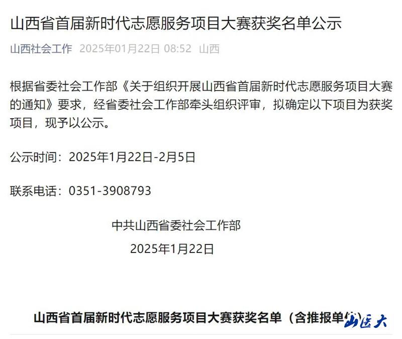 為推動全省志愿服務事業高質量發展,1月17日,山西省委社會工作部舉辦了全省首屆各行各業新時代志愿服務項目大賽。第一醫院的志愿服務項目“南丁格爾——‘救’在身邊”榮獲二等獎。
