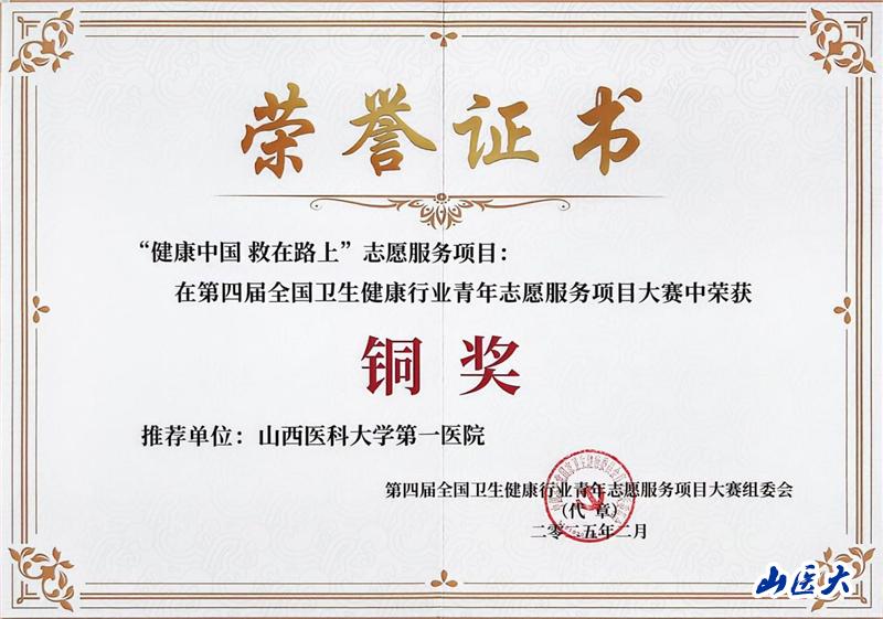 3月19日至21日,第四屆全國衛(wèi)生健康行業(yè)青年志愿服務項目大賽頒獎典禮暨全國衛(wèi)生健康行業(yè)青年志愿服務聯(lián)盟年會在北京舉行,第一醫(yī)院急診醫(yī)學中心“救在分秒”志愿服務隊參賽項目“健康中國,救在路上”榮獲銅獎。