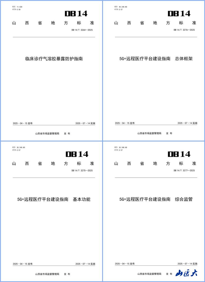 近日,由我校第二醫(yī)院柴國麗團隊、侯冉團隊牽頭,聯(lián)合多家醫(yī)療機構(gòu)共同編制的四項山西省地方標(biāo)準正式發(fā)布,將于2025年7月14日起實施。這四項標(biāo)準涵蓋臨床診療防護和遠程醫(yī)療建設(shè)兩大領(lǐng)域,標(biāo)志著山西省醫(yī)療健康標(biāo)準化建設(shè)取得重要突破。