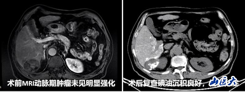 手術過程中,在CBCT的實時引導下,團隊精準鎖定患者腫瘤的三支供血動脈,并利用微導管逐一超選至目標血管,順利完成化療栓塞。栓塞后造影顯示腫瘤血管完全消失,病灶碘油沉積良好。術后一周復查CT,碘油沉積范圍與PET/CT提示的活性病灶范圍完全一致,治療效果明顯。