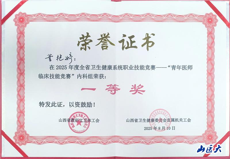 在本次大賽的個人獎項角逐中,董艷婷憑借其在內科領域全面過硬的臨床技能、精準的臨床判斷和穩定的臨場發揮,在“青年醫師臨床技能競賽”中力拔頭籌,斬獲內科組一等獎,充分展現了我校青年醫師的頂尖個人實力。