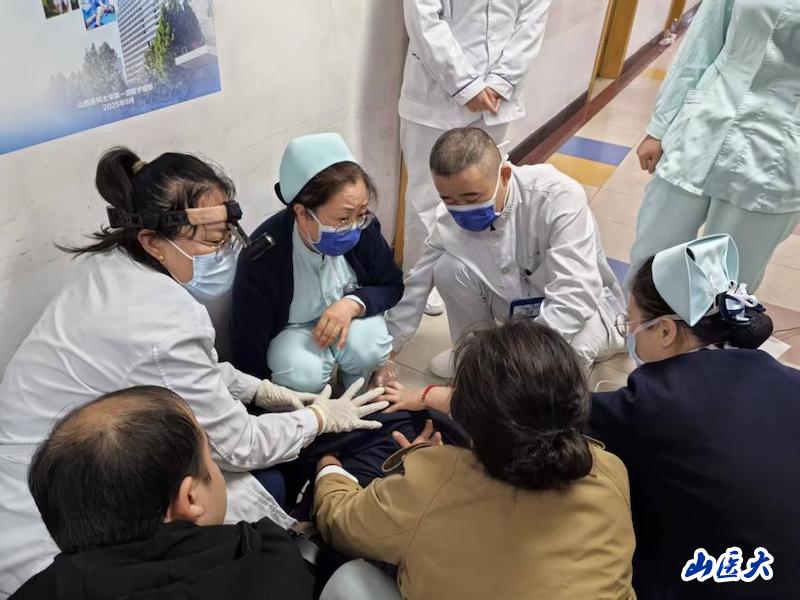 一位五十多歲的中年男性被120工作人員緊急推入急診醫(yī)學中心綜合診室,他面色發(fā)紺、呼吸困難,雙手緊緊抓著喉嚨。一場與死神的賽跑在走廊上驟然開始。此時急診室內擠滿了候診患者,轉運平車一時難以通行。時間就是生命,一秒都不能耽擱!“讓開通道!”王鳳云老師一聲令下,搶救的節(jié)奏瞬間啟動。弓濤護士迅速清空急救區(qū)域,推著搶救車、手持氣管插管箱沖在前面;王凱鑫護士跪在地上,一針見血迅速建立靜脈通路;實習護士穩(wěn)穩(wěn)舉著照明燈,為耳鼻咽喉——頭頸外科醫(yī)生照亮操作視野……