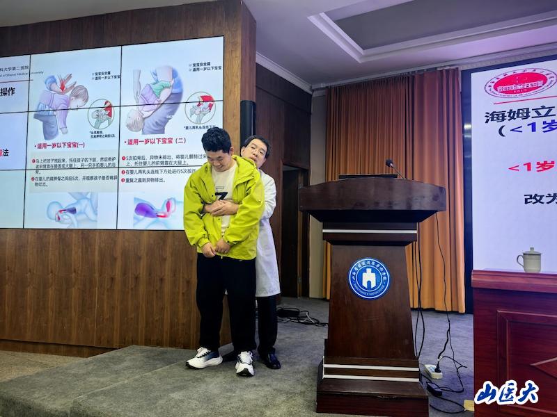 活動現。絞艫詼醫院西院區急診科馮卉平醫師率先以《什么是海姆立克急救法》為題展開科普。她結合真實案例,針對不同年齡、不同場景,細致拆解海姆立克急救法的操作要點,讓在場師生深刻認識到急救不是醫生的“專利”,每個人都可以成為第一響應人。為避免“學完就忘”,醫護人員還邀請學生上臺扮演“被卡喉者”,現場演示“環抱姿勢、發力技巧”,并特別強調“施救時需站穩,防止被反作用力帶倒”。