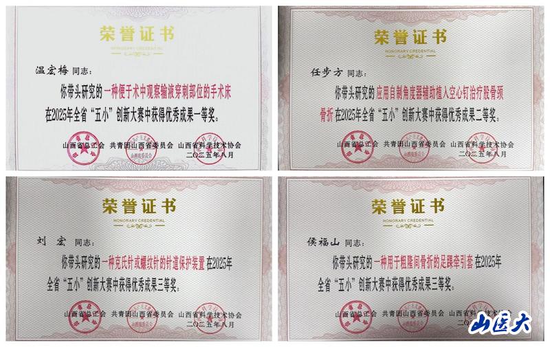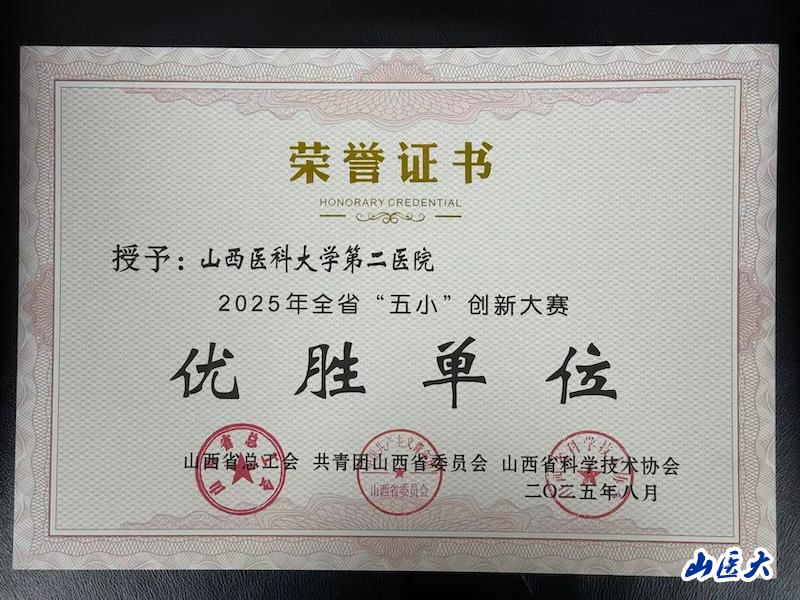 近日,從“五小凝眾智創新贏未來”2025年山西省“五小”創新大賽優秀成果展傳來捷報,我校附屬第二醫院憑借扎實的創新實踐與高效的組織推動,一舉榮獲大賽“優勝單位”稱號,遴選申報的四項創新項目全部獲獎,分別摘得一、二、三等獎,在全省群眾性創新舞臺上充分彰顯了醫院的臨床創新活力與成果轉化實力。
