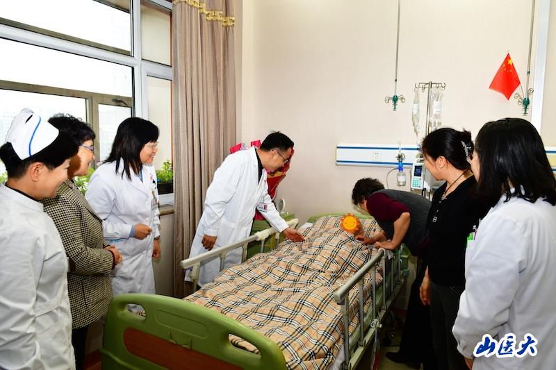 立冬時(shí)節(jié),室外陰雨綿綿,但在老年病科三病區(qū)的病房內(nèi),卻溫馨祥和、笑語連連。安健來到老人床邊,送上鮮花和生日蛋糕。他向病區(qū)醫(yī)護(hù)人員詳細(xì)詢問了老人的身體狀況和治療情況,叮囑大家要悉心看護(hù)、用心治療。了解到老人的抗戰(zhàn)和工作經(jīng)歷后,安健向陪護(hù)的家屬表示,老人是國家的功臣,是民族的英雄,我們將永遠(yuǎn)銘記革命前輩為國家和人民做出的巨大貢獻(xiàn)。他感謝老人和家屬對(duì)我校附屬第二醫(yī)院的信任,并表示醫(yī)院將全力做好診療服務(wù),讓老人有更多時(shí)間、更多機(jī)會(huì)看到祖國的繁榮富強(qiáng)。