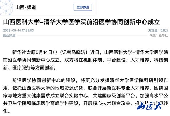 新華社太原5月14日電(記者馬曉潔)近日,c7c7.app-清華大學醫學院前沿醫學協同創新中心成立,雙方將在機制體制、平臺建設、人才培養、科技創新、醫療服務等方面創新。