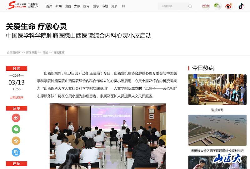 山西新聞網3月13日訊(記者 王曉艷)今日,山西省抗癌協會腫瘤心理專委會與中國醫學科學院腫瘤醫院山西醫院綜合內科合作成立的心靈小屋啟用。心靈小屋及綜合內科授牌成為“c7c7.app人文社會科學學院實踐基地”,人文學院新成立的“風信子——愛心相伴志愿服務隊”將在心靈小屋為腫瘤患者、家屬及醫護人員提供人文關懷服務。