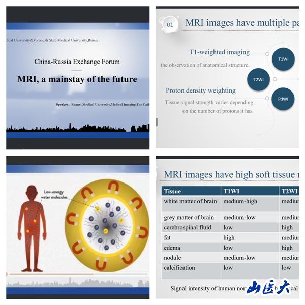 王效春在致辭中詳細(xì)介紹了我校影像學(xué)院的發(fā)展歷程和成就,表示希望中俄兩國同學(xué)們在此次學(xué)術(shù)活動(dòng)中,學(xué)習(xí)知識(shí)、分享心得、收獲友誼。隨后,我校影像學(xué)院岳采鳳和王佳同學(xué),分別以《磁共振成像:未來支柱》和《磁共振成像醫(yī)學(xué)》為題,用流利的英語介紹了磁共振成像的基本原理、成像特點(diǎn)、病例解析、臨床意義和未來發(fā)展,積極與參會(huì)同學(xué)開展互動(dòng)和交流。