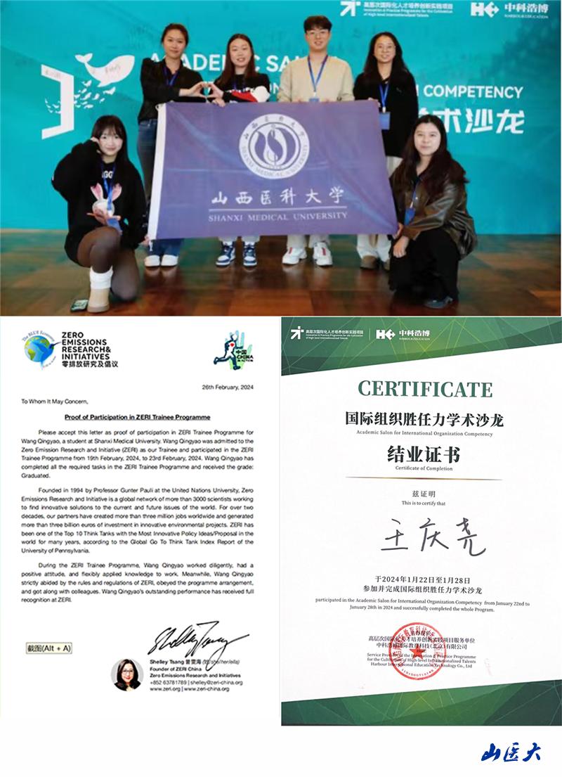 2024年寒假,我校公共衛生學院6名同學由學校獎學金支持,參加了“高層次國際化人才培養創新實踐項目——國際組織勝任力學術沙龍”,表現優異,順利獲得結業證書。其中,王慶堯、王元昊、常銘洋和祝思迪圓滿完成國際組織——零排放研究和倡議的線上見習工作,獲得見習證書。