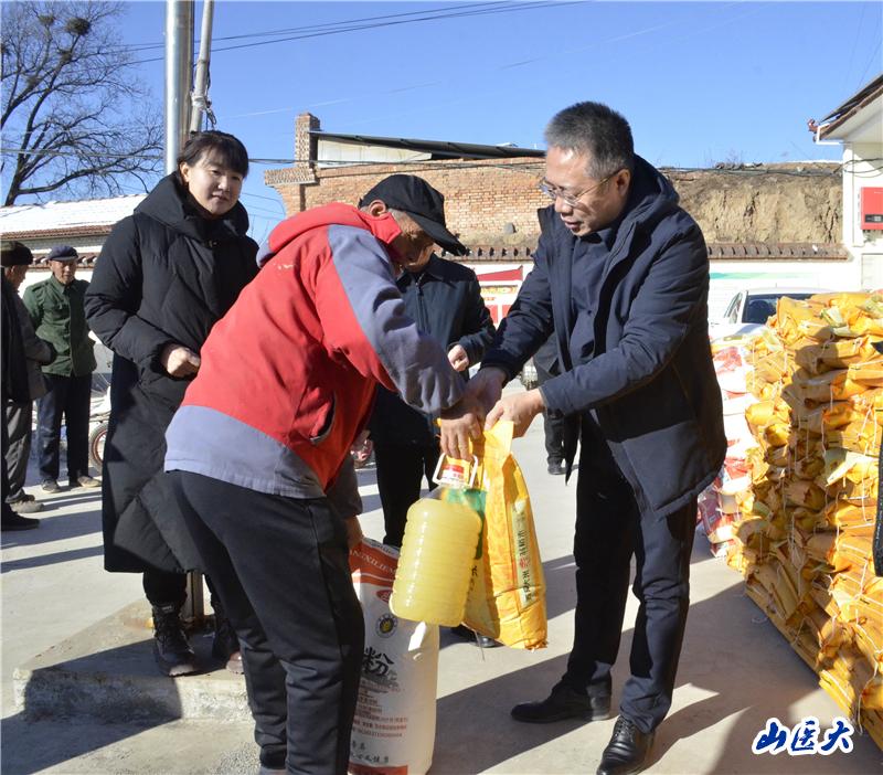 歲末寒冬,春節將至。1月23日,我校第二醫院黨委書記成曉龍帶領人事處等相關部門人員深入醫院定點幫扶的武鄉縣豐州鎮郝家垴村開展“迎春節 送溫暖”慰問活動。