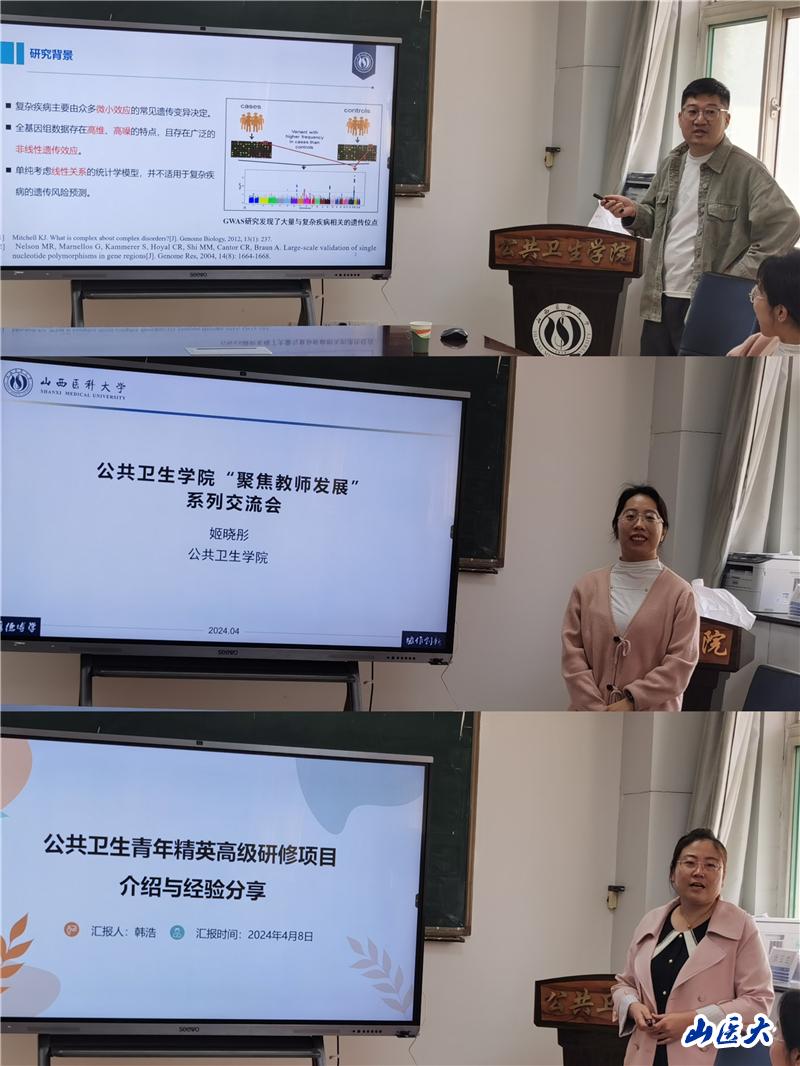 第一期交流會(huì)的主題圍繞師資培訓(xùn)項(xiàng)目展開,共三講,分別由參加國家公派聯(lián)合培養(yǎng)博士計(jì)劃項(xiàng)目的劉龍實(shí)驗(yàn)師、國內(nèi)訪學(xué)項(xiàng)目的姬曉彤副教授、中華預(yù)防醫(yī)學(xué)會(huì)公共衛(wèi)生青年精英高級研修項(xiàng)目的韓浩副教授進(jìn)行匯報(bào)交流,3位老師的匯報(bào)交流內(nèi)容豐富詳實(shí),分別從在新西蘭奧克蘭大學(xué)、復(fù)旦大學(xué)、北京大學(xué)以及國家疾控中心的學(xué)習(xí)生活經(jīng)歷、收獲和感悟等方面進(jìn)行了毫無保留地分享和交流。會(huì)場氣氛輕松活躍,老師們交流熱烈,收獲滿滿。