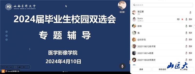 4月10日,我校醫學影像學院舉辦了2024屆畢業生雙選會專題輔導會,邀請畢業生就業指導中心副主任任燕作專題輔導。醫學影像學院黨總支副書記郭曄,畢業班輔導員及畢業班學生等參加了會議。