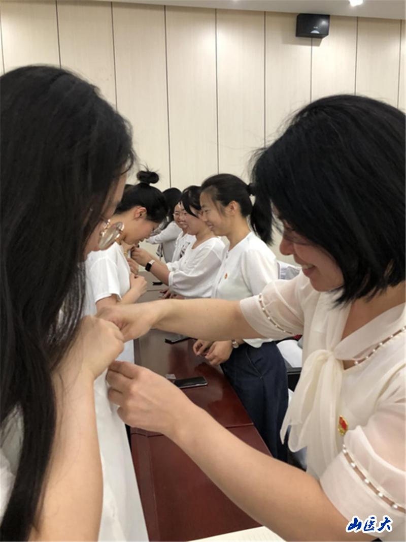 活動在莊嚴(yán)的國歌聲中拉開序幕,研究生第一黨支部書記張敏宣讀了2024年上半年新發(fā)展黨員名單。全體黨員在研究生第三黨支部書記魏貝的帶領(lǐng)下高舉右拳莊嚴(yán)宣誓。宣誓結(jié)束,老師們?yōu)樾掳l(fā)展黨員佩戴黨員徽章。