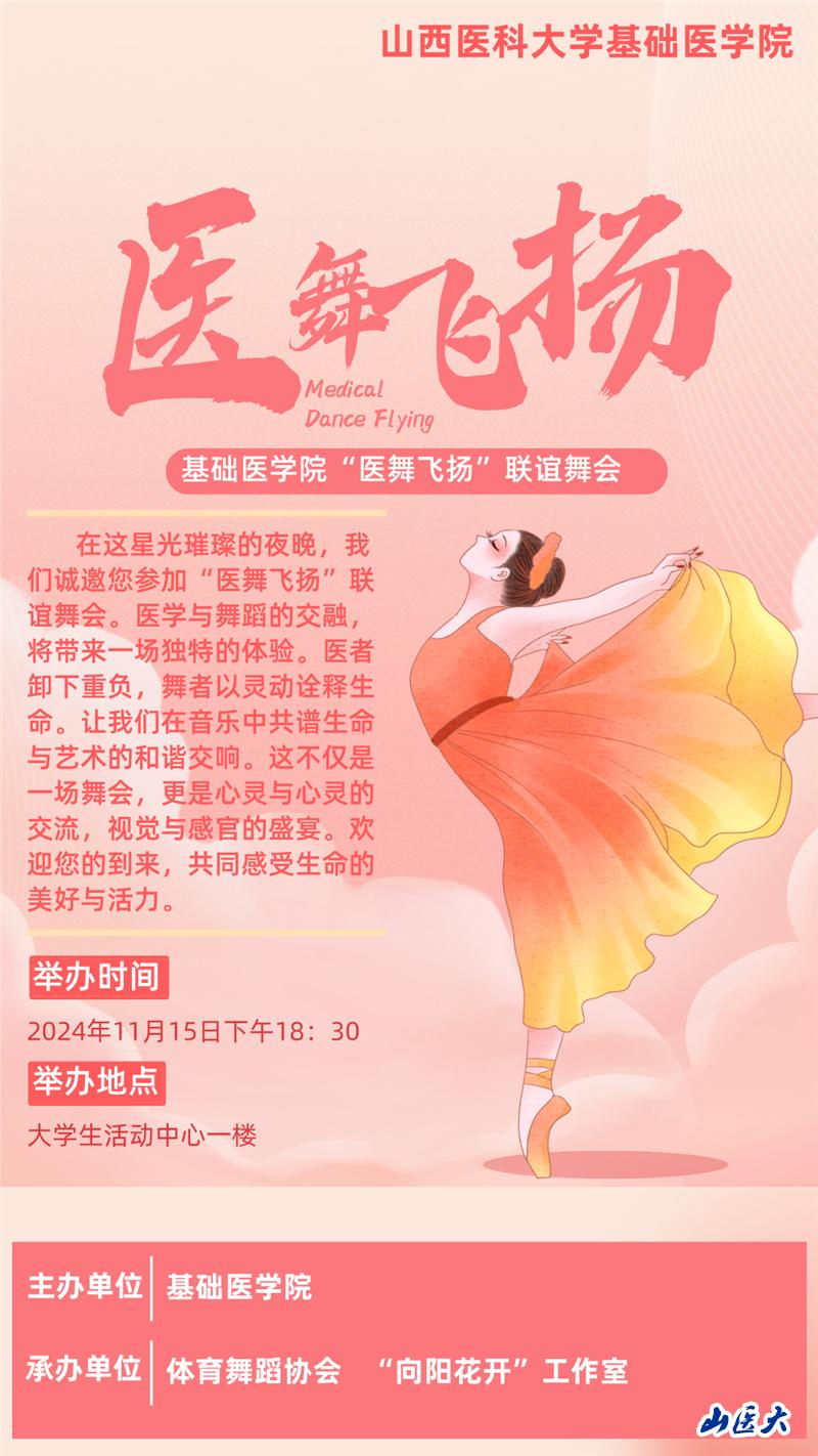 為進一步充分發揮高校美育育人功能,提升學生的人文素養,推進高質量醫學人才培養,11月15日晚,基礎醫學院在中都校區大學生活動中心舉辦“醫舞飛揚”聯誼舞會。活動邀請學校社聯體育舞蹈協會師生指導,學院2024級60名學生通過“第二課堂”系統報名參加。