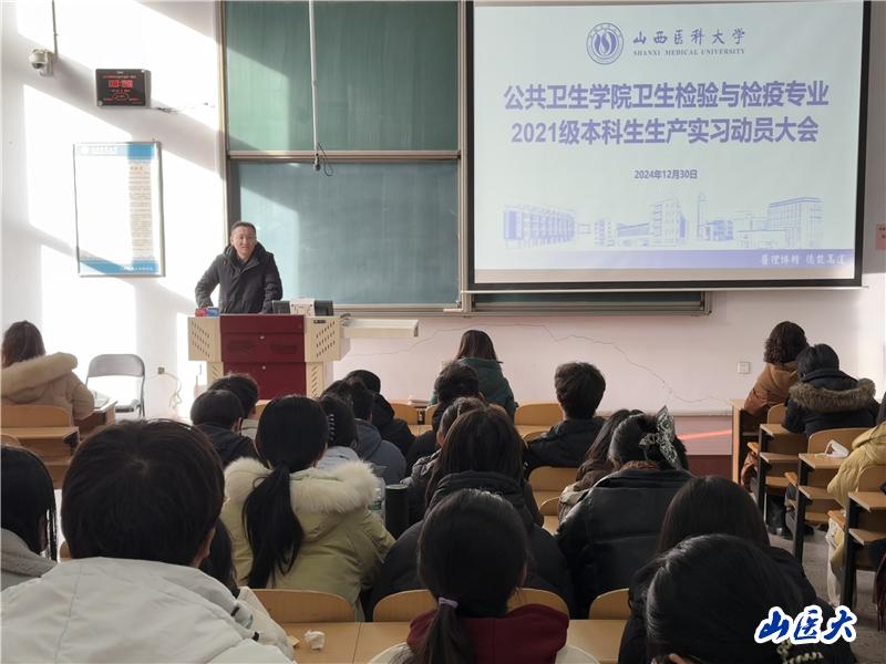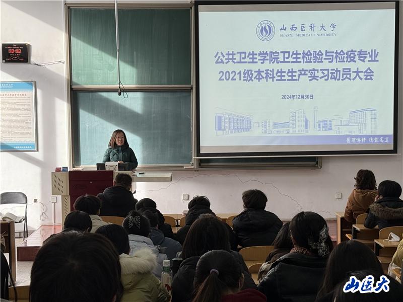為扎實做好2021級衛檢專業生產實習工作,引導學生明確實習目標,端正實習態度,12月30日上午,公共衛生學院2021級衛生檢驗與檢疫專業在中都校區召開生產實習動員大會。公共衛生學院黨委副書記蔚鈺瓊、副院長聶繼盛出席并作動員講話,論文指導教師代表宋歡、王芳、教學秘書張蓉和2021級衛檢專業全體學生參加。會議由思想政治輔導員張瑾主持。