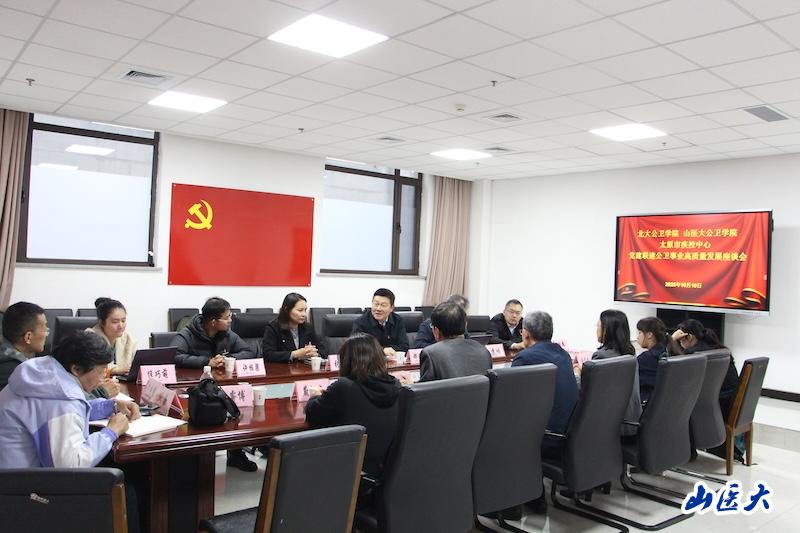 10月10日,高水平公共衛(wèi)生學(xué)院黨建共同體成員單位北京大學(xué)公共衛(wèi)生學(xué)院、我校公共衛(wèi)生學(xué)院與太原市疾病預(yù)防控制中心開(kāi)展黨建業(yè)務(wù)交流座談會(huì)。北京大學(xué)公共衛(wèi)生學(xué)院黨委書(shū)記郝元濤、黨委副書(shū)記蘇鴻,太原市疾病預(yù)防控制中心黨委書(shū)記、主任徐計(jì)宏,黨委副書(shū)記錢(qián)月紅,副主任郝瑞崗、張萍,我校公共衛(wèi)生學(xué)院黨委書(shū)記張志紅、副院長(zhǎng)邱服斌、黨委副書(shū)記蔚鈺瓊、副院長(zhǎng)宋歡等出席會(huì)議。來(lái)自各方的黨員代表共70余人參加了會(huì)議。
