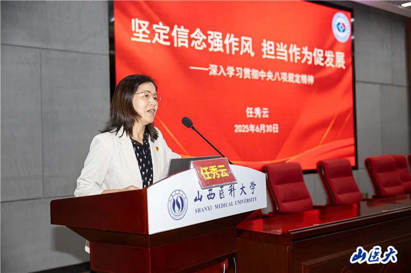 任秀云圍繞“開展深入貫徹中央八項規(guī)定精神學習教育的重要意義”“醫(yī)療領(lǐng)域易發(fā)問題和風險點警示”“以優(yōu)良作風推動醫(yī)院事業(yè)高質(zhì)量發(fā)展”三個方面進行了系統(tǒng)講述。她表示,作風建設(shè)是一場攻堅戰(zhàn)、持久戰(zhàn)。在全面從嚴治黨新起點上,通過開展深入貫徹中央八項規(guī)定精神學習教育,進一步密切黨群干群關(guān)系、鞏固黨的執(zhí)政基。涼刂匾。開展深入貫徹中央八項規(guī)定精神學習教育的成效主要體現(xiàn)在為人民群眾辦實事、解難題上。要通過學習教育,從思想根源上糾治脫離群眾的不良風氣,重塑黨員干部艱苦奮斗的作風。她激勵大家錨定口腔醫(yī)學院2025年8大重點工作,迎難而上、攻堅克難,以“釘釘子”精神將學習成效轉(zhuǎn)化為推動口腔醫(yī)學院各項工作高質(zhì)量發(fā)展的強大動力。