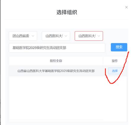 5、在“選擇組織”處,按下圖所示進行選擇:團山西省委-c7c7.app團委-c7c7.app基礎醫學院團委-如圖