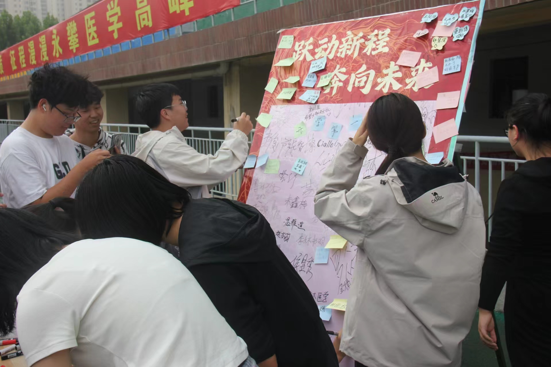 新生們在展板留言,相互勉勵盡快適應新環境、奮勇前行,期許自己在新學期堅守初心、篤行不?。∠遠暈蠢辭笠街返募岫ㄓ肴瘸?。