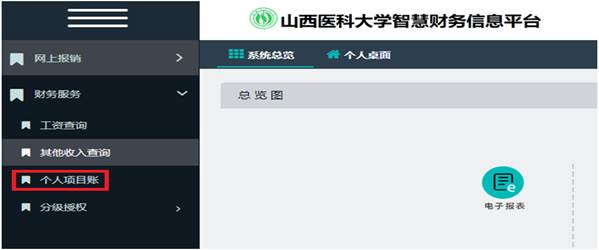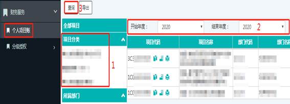 2、登陸后,頁面左側(cè)菜單欄點擊“財務(wù)服務(wù)”按鈕,下拉菜單選項中選擇“個人項目賬”,即可查詢。
