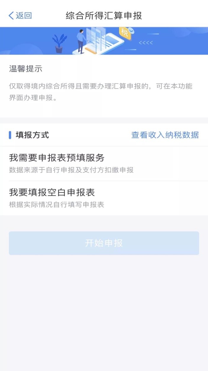 2、選擇填報(bào)方式,建議選擇“使用申報(bào)數(shù)據(jù)進(jìn)行填報(bào)”,也可以是“自行填寫(xiě)”;此頁(yè)面您可以點(diǎn)擊“查看收入納稅數(shù)據(jù)”,展示“收入納稅數(shù)據(jù)”和“專項(xiàng)附加扣除采集記錄”。