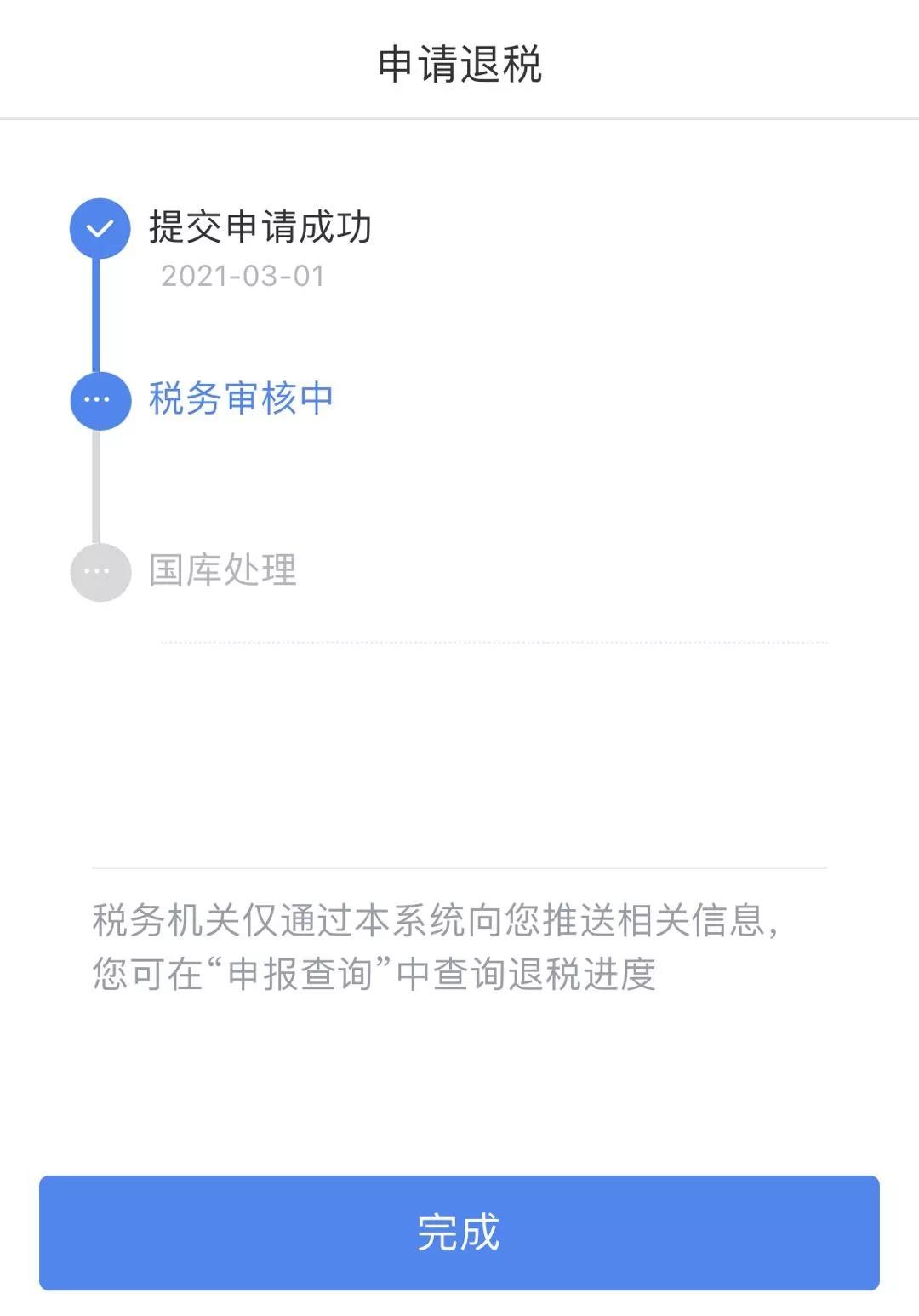 申報(bào)成功,如果退稅則跳轉(zhuǎn)到申報(bào)成功-退稅頁(yè)面,點(diǎn)擊申請(qǐng)退稅。選擇綁定的銀行卡,點(diǎn)擊確定即可。