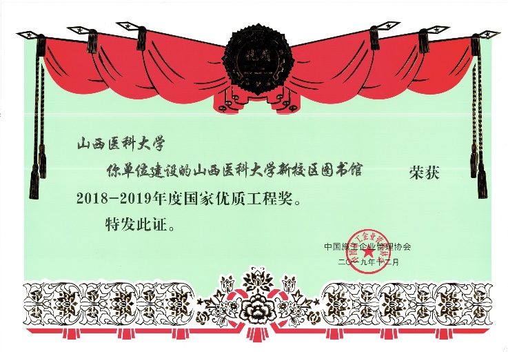 在經歷過無數次“白+黑、戰晴天、搶雨天”的艱苦奮戰后,圖書館項目最終實現“質量創優、品牌創譽、管理創新”的施工目標。先后獲得山西省建筑安全標準化優良工地、山西省優秀設計獎、國家級QC成果、專利及省級工法、山西省“太行杯”土木工程大獎、山西省優質工程最高獎“汾水杯”等多項榮譽。