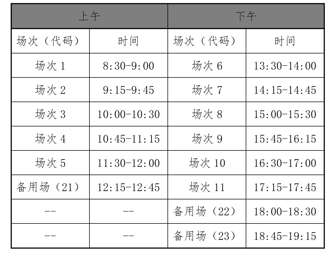 英語四級口語考試(CET-SET4)考試時間為5月20日(F221次),英語六級口語考試(CET-SET6)考試時間為5月21日(S222次),具體場次安排如下: