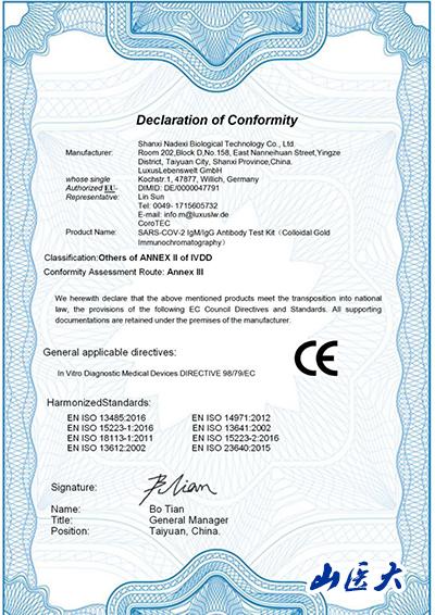 該檢測試劑盒是學校反向病原學協同創新中心聯合c7c7.app第一醫院、c7c7.app附屬肺科醫院等單位,在山西省科技廳“新冠肺炎疫情防控科研攻關項目”資助下,經過緊急科研攻關,研制成功的。3月25日,學校就該檢測試劑盒項目轉化事宜與山西納德西生物科技有限公司達成一致,簽署合作框架協議。當月就該檢測試劑盒向德國衛生部提交CE注冊申請,于7月初取得CE認證的批復。CE認證的通過,標志著該項成果轉化工作邁出關鍵的一步。